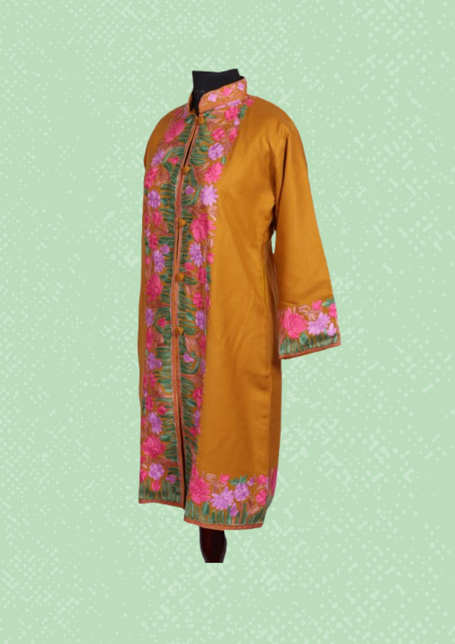 Yellow Ochre Cashmilon Wool Aari Embroidered Kashmiri Pheran - Pehnava