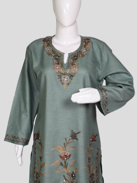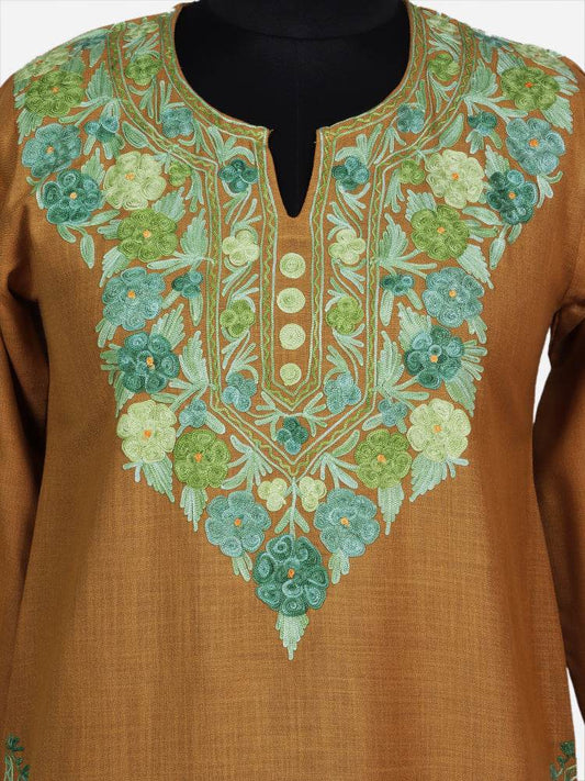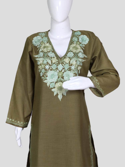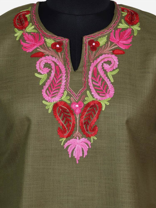nAARI Olive Green Kashmiri Aari Embroidered Cotton Kurti
