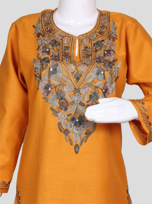 nAARI Mustard Yellow Kashmiri Aari Embroidered Cotton Kurti