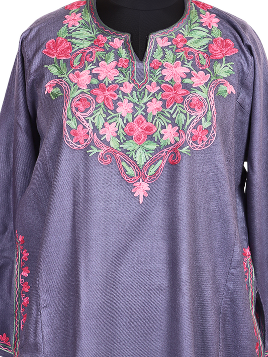 Lavender Purple Cashmilon Wool Aari Embroidered Kashmiri Pheran - Pehnava