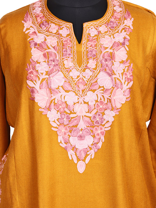 Golden Yellow Cashmilon Wool Aari Embroidered Kashmiri Pheran - Pehnava