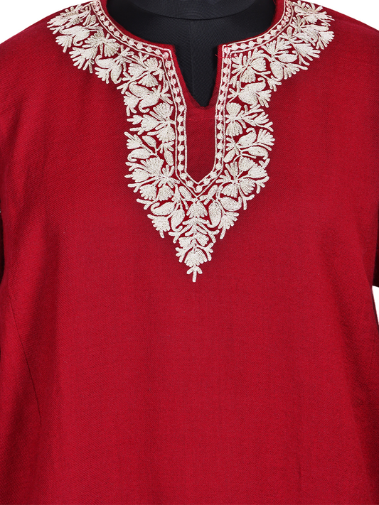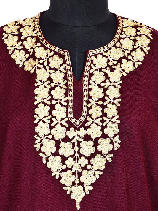 Maroon Red Cashmilon Wool Zari Embroidered Kashmiri Pheran - Pehnava