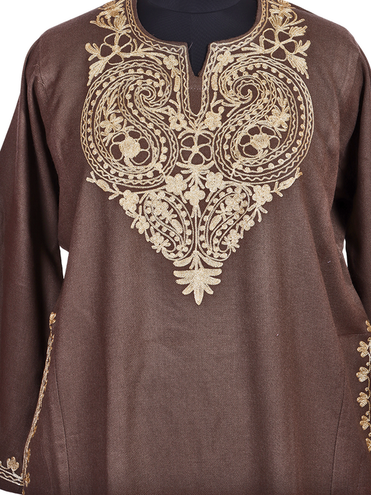 Dusky Brown Cashmilon Wool Zari Embroidered Kashmiri Pheran - Pehnava