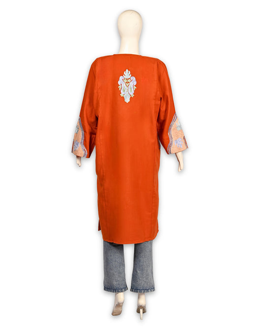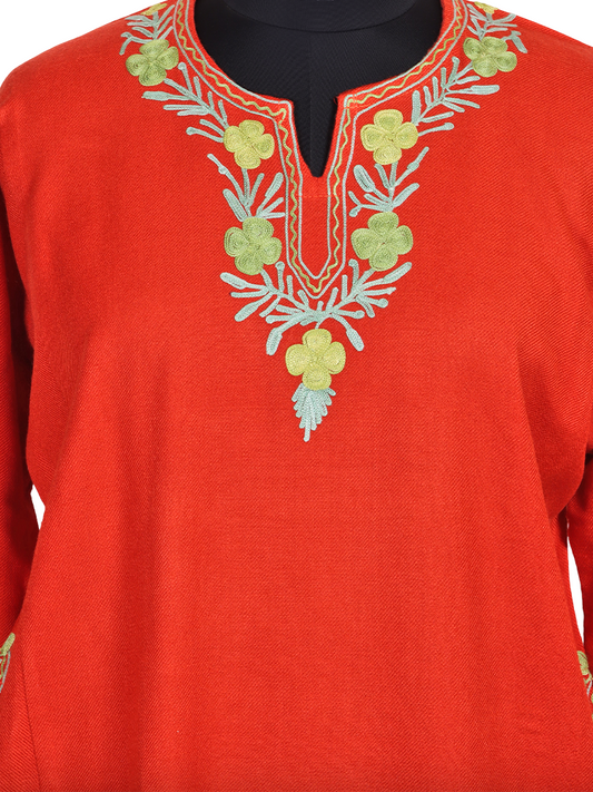 International Orange Cashmilon Wool Aari Embroidered Kashmiri Pheran - Pehnava