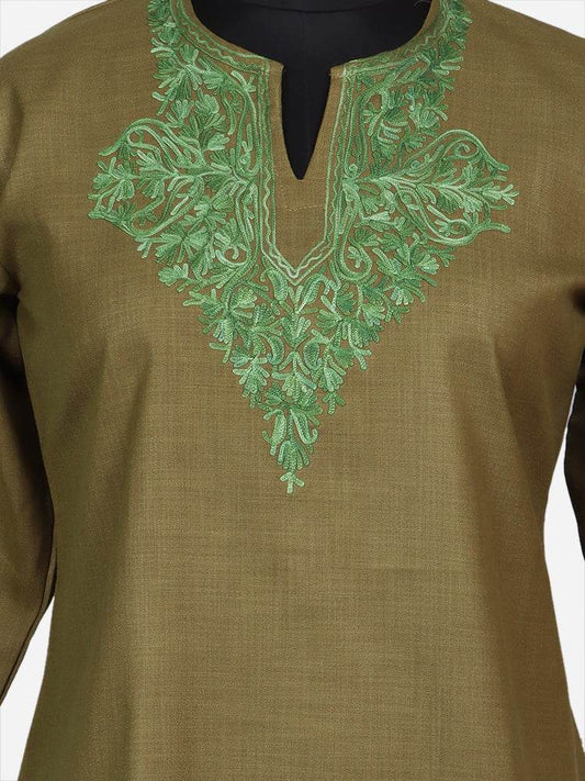 nAARI Olive Kashmiri Aari Embroidered Cotton Kurti