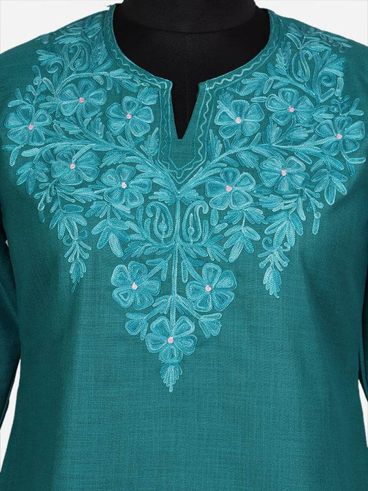 nAARI Dark Aqua Green Kashmiri Aari Embroidered Cotton Kurti
