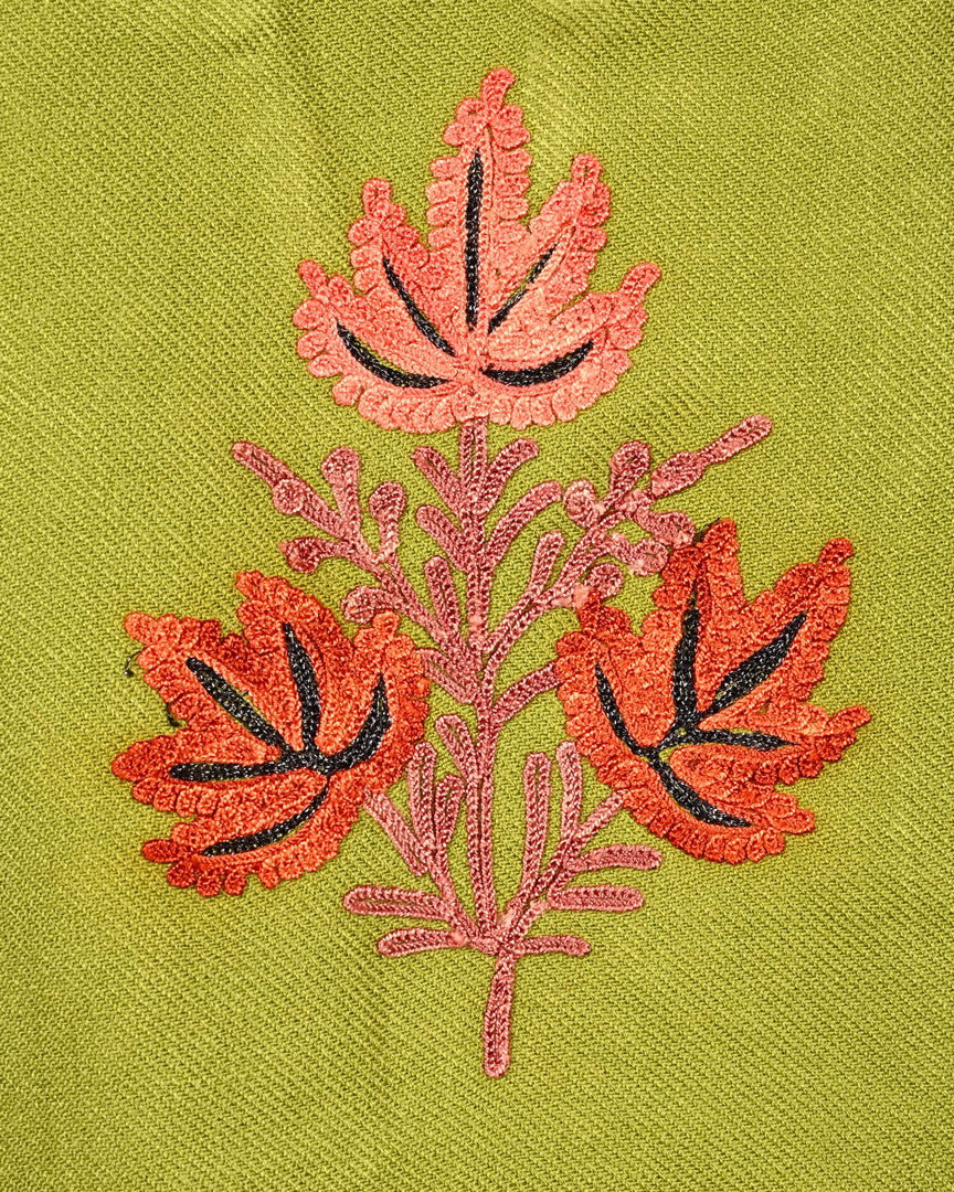 A winter favorite with a lift of colour. This Aari-embroidered pheran comes in fresh avocado green that looks bright in daylight and warm indoors. The Cashmilon pheran feels soft and brushed against the skin, warmly comfortable and non-itchy, and it drapes smoothly without clinging. The silhouette is relaxed and straight with calf-length coverage, short side slits for easy movement, and a clean round neck with a small V-notch. It layers easily over a thermal or light sweater and pairs well with leggings, jeans, or tailored trousers for everyday winter wear, festivals, weddings, and other celebrations. This phiran is embellished with Aari-embroidered chinar bootis. The chinar being Kashmir’s signature tree and state symbol, sets the tone for a garden story across the surface. The neckline blooms with stylised chinar leaves and fine leaf-sprays; the sleeves echo the motif with shaped panels; and a wide hem border unfolds in coral and terracotta with subtle dark accents. Side pockets are minimally finished to blend with the overall look. A single chinar buta at the back completes the design. Colour and craft add glow, lifting the avocado base beautifully. Calf-length Kashmiri pheran with a relaxed fit for layering over sweaters. Short side slits for ease of movement. Match your Kashmiri pheran with leggings, jeans, or tailored trousers according to the occasion. For footwear, go for loafers at work, boots in winter, and ballerinas for everyday comfort. Complete it with a pashmina or a light scarf as a headscarf or around your neck. Dry clean or hand wash separately in cold water.